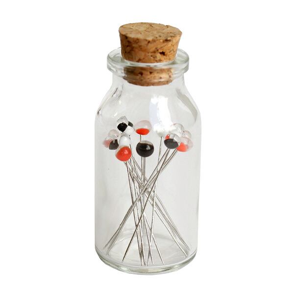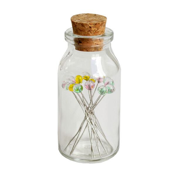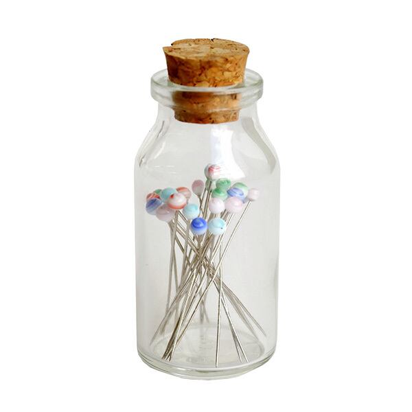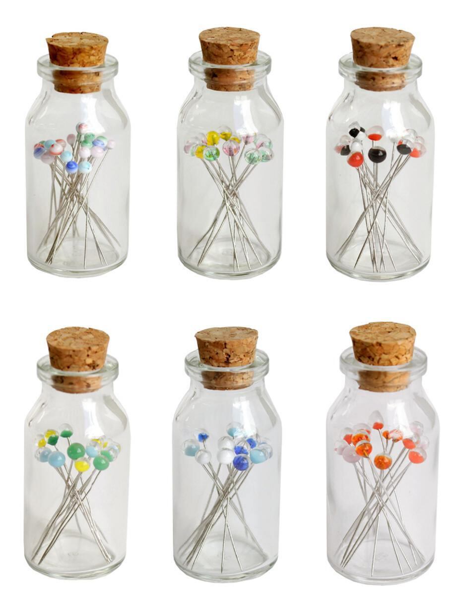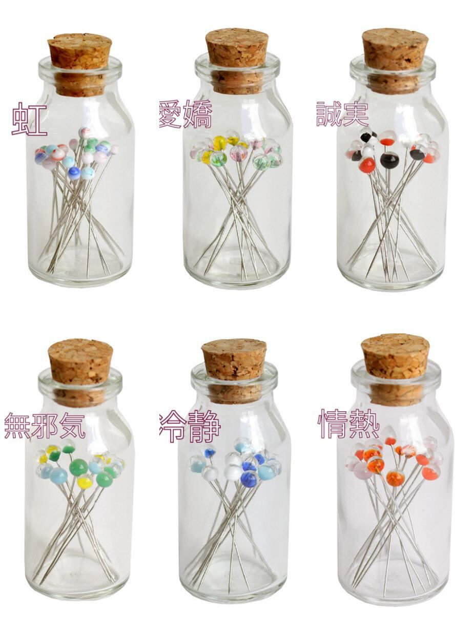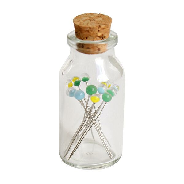 ガラス玉が頭になった綺麗な待ち針です。ガラス瓶に入っているので持ち運びにも便利です。