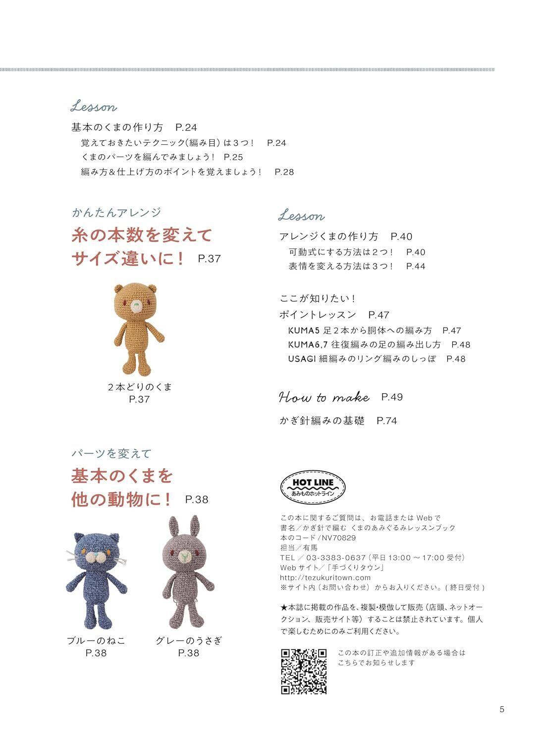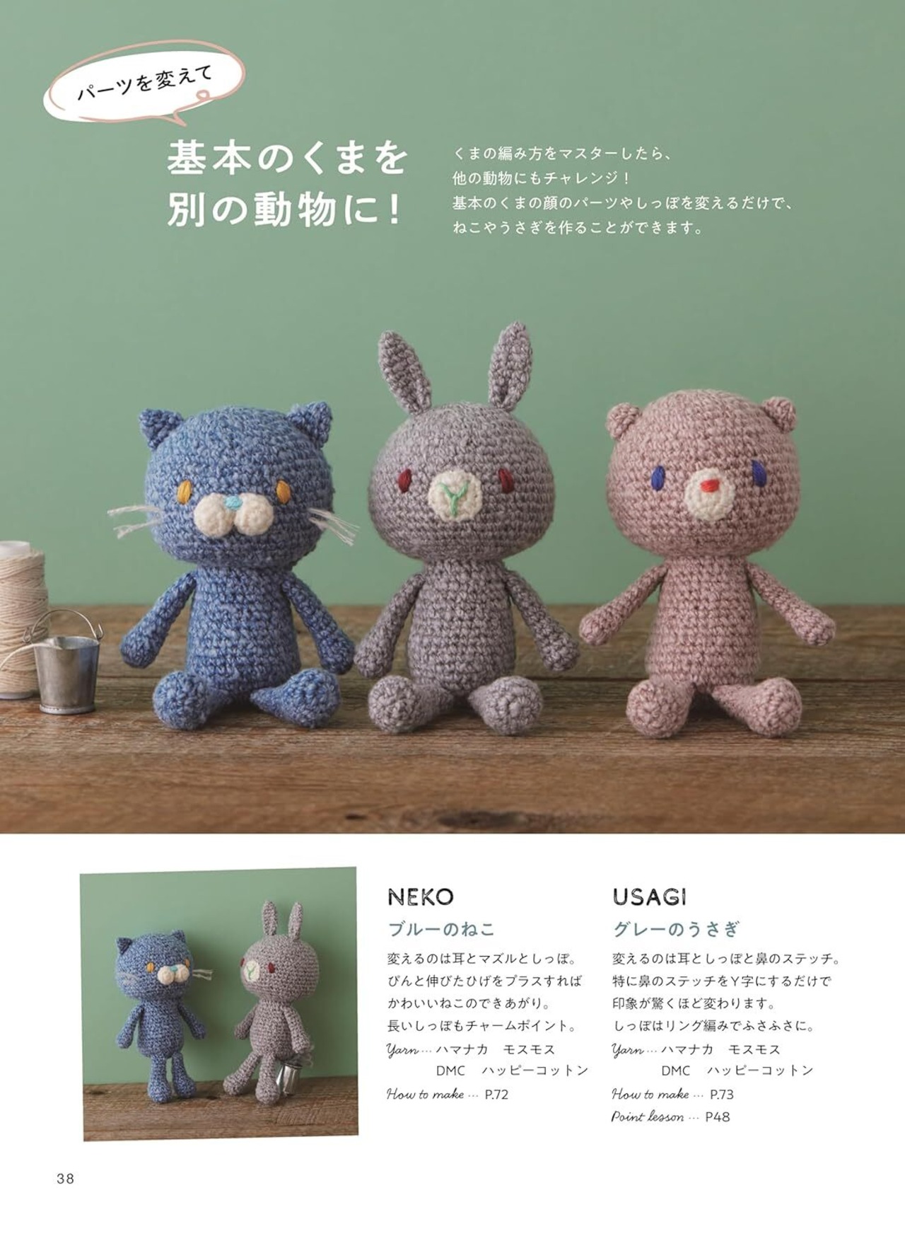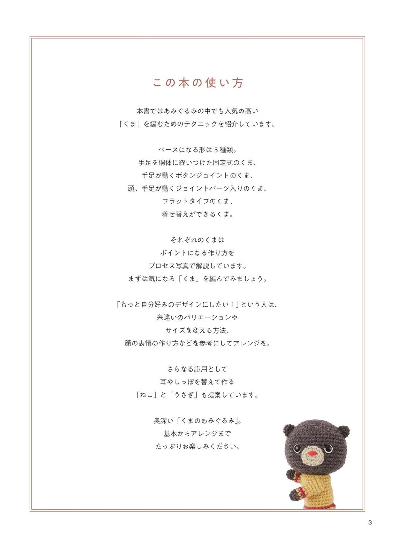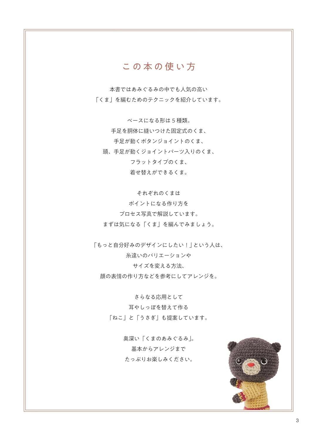 あみぐるみの定番である「くま」をテーマに、あみぐるみの基本テクニックとアレンジ方法を詳しく解説します。頭や手足などのパーツの編み方・編み図の見方からスタートして、組み立て方も手足固定タイプ、ボタンやジョイントパーツで手・足・首が動くタイプ、フラットタイプなどさまざまなパターンを紹介。楽しく遊べる着せ替え小物、顔パーツの種類(刺しゅう・縫いつけ・差し込み)や表情の作り方、パーツを変えて猫やウサギにするアレンジも。初心者はもちろん、レベルアップしたい経験者にもおすすめ。子供から大人まで楽しめる、おしゃれでかわいい1冊です。
