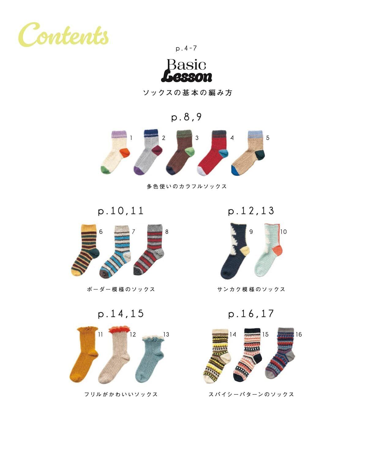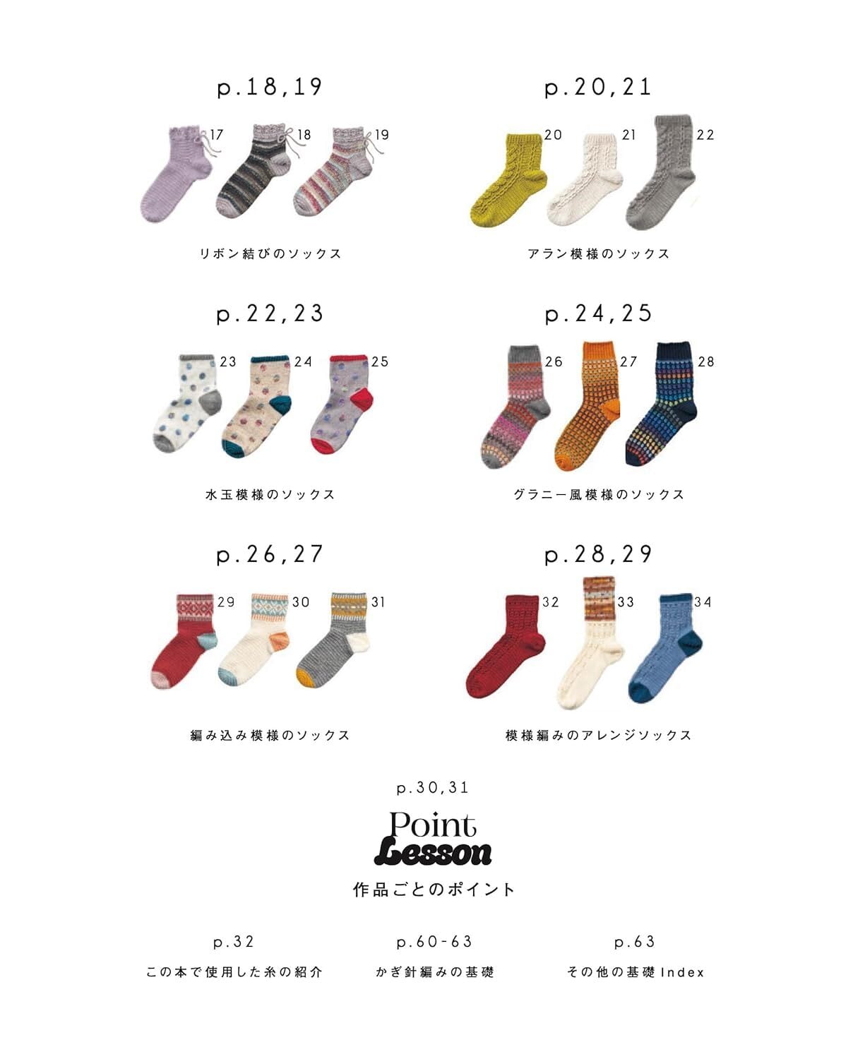 かぎ針編みでザクザク編めるソックスを、アラン模様、スパイシーパターン、ボーダー模様、など、さまざまなデザインで紹介。